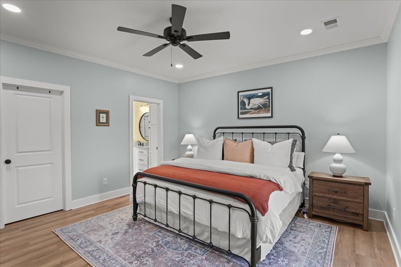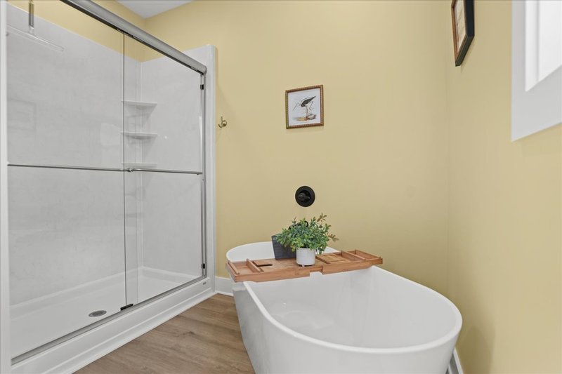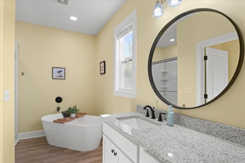 Retreat to the serene primary suite, where a luxurious free-floating soaking tub and separate walk-in shower creates a spa-like experience or step outside into your private screened in porch that is surrounded by nature and gentle wildlife.