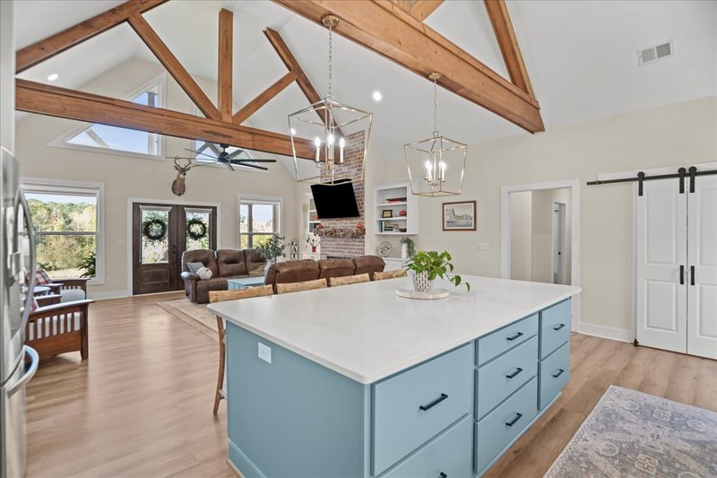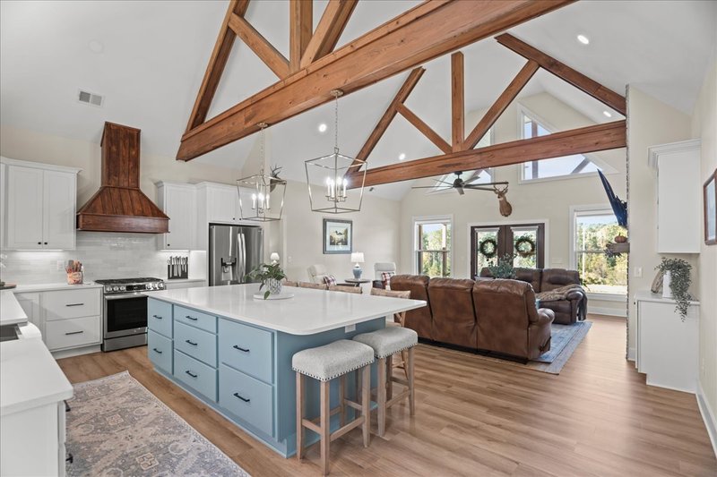 Step inside to an open-concept living space featuring soaring vaulted ceilings adorned with elegant wooden beams and a warm glow from the gas log fireplace. The chef’s kitchen is the heart of the home, showcasing a stunning oversized island that comfortably seats six, a walk-in pantry with built-in shelving, and top-quality appliances—all included.