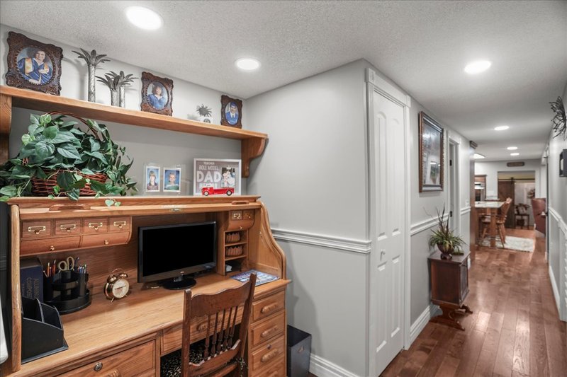 Two storage buildings offer ample space for tools, hobbies, or equipment, while the dog kennel and chicken coop add flexibility for pet owners or those looking to enjoy a bit of country living. The attached garage features built-in cabinetry, adding even more functionality to this exceptional property.