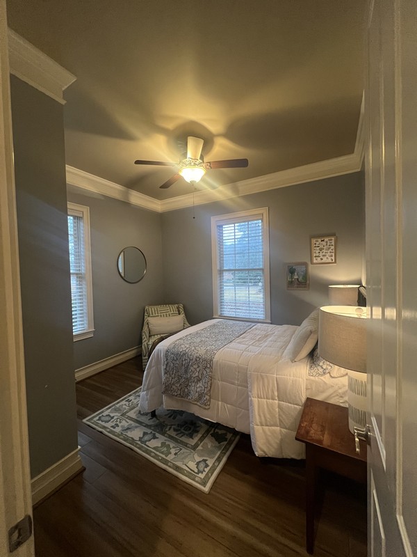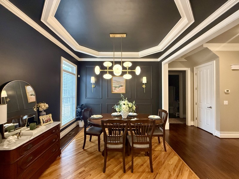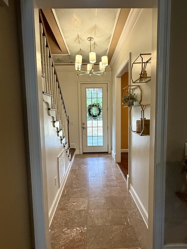 Stunning custom stucco home tucked away in the town limits of Chesterfield, offering privacy, craftsmanship, and over 3,400 square feet of elegant living space. This 5-bedroom, 3-bath home features beautiful hardwood floors, tall interior doors, crown molding, and soaring ceilings throughout. Designer lighting, tray and coffered ceilings, and custom accent wall treatments add a luxury feel throughout the main living areas and bedrooms. The formal dining room and spacious living areas make this home ideal for entertaining, while a dedicated study provides a perfect work-from-home space. The expansive upstairs bonus area offers endless possibilities for recreation, media, or additional living space, with abundant storage throughout. A welcoming covered front porch and mature landscaping enhance the exterior. Recent updates include a brand-new roof and new gutters. This home offers timeless style, quality construction, and exceptional space in a peaceful setting.